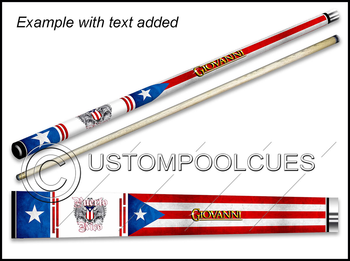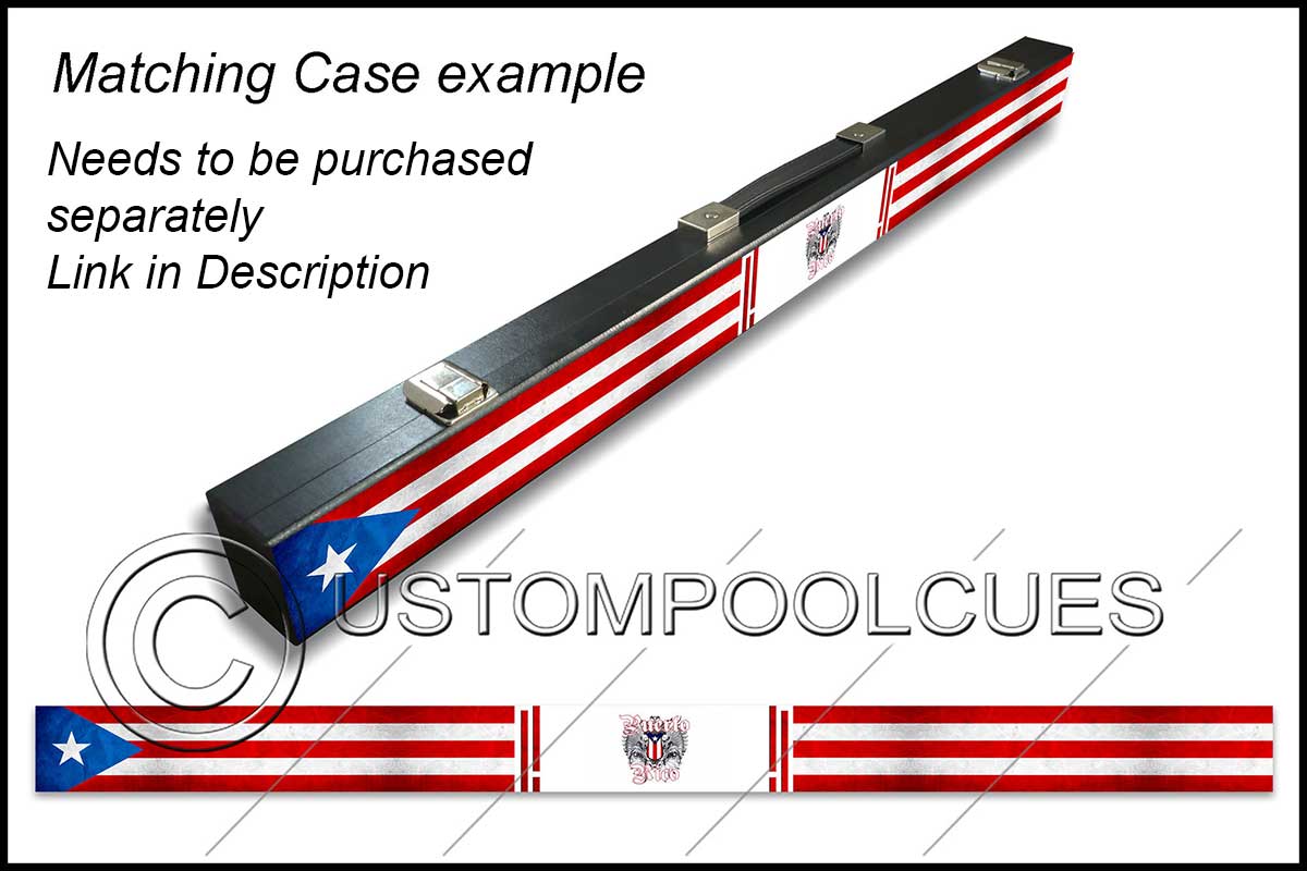 This printed vinyl design with additions will be applied & sealed to a quality tested 57″ two-piece ash cue with your chosen tip & weight options.