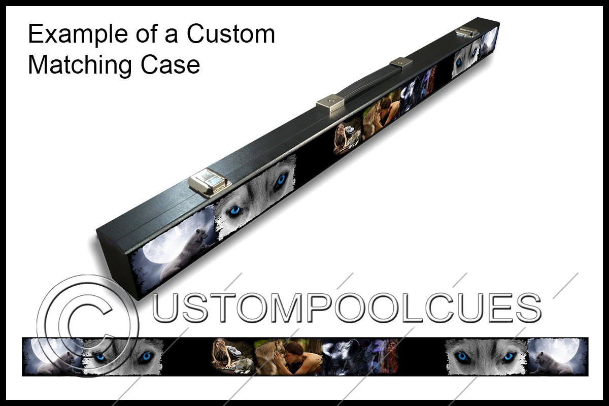 This printed vinyl design with additions will be applied & sealed to a quality tested 57″ two-piece ash cue with your chosen tip & weight options.